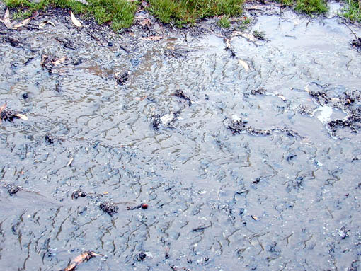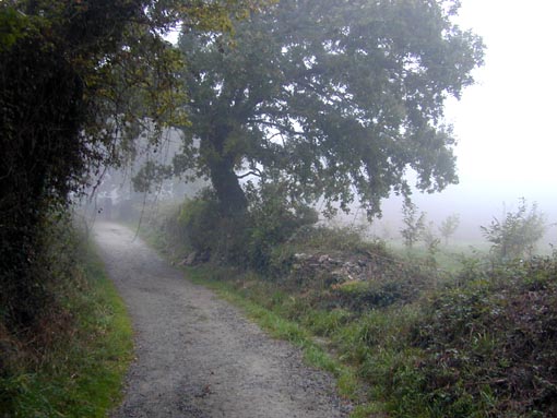 In der Nacht hatte es noch in Strömen gegossen. Gegen Morgen klarte es auf, die Luft war aber noch dunstig und feuchtigkeitsgeschwängert. Das erste Bild machte ich kurz nach halb neun, eineinhalb Stunden nach meinem Aufbruch aus dem am Nachmittag und Abend noch sonnigen Arzúa. In der morgendlichen Dunkelheit, auf einem schon am Tage düsteren Waldweg, wo man ohne Lampe die sprichwörtliche Hand vor Augen nicht sah, traf ich auf zwei Franzosen, die mich vorsorglich schon von weit her anriefen, als sie den schwankenden Schein meiner Taschenlampe wahrnahmen. Der Glühfaden ihrer Lampe war durchgebrannt und sie freuten sich sehr über mein Kommen. Der ältere der beiden hatte den camino francés schon einige Male solo geschafft, wie er mir auf englisch erzählte - mein karges Französisch brauchte ich also nicht zu bemühen, es ist verdrängt von der mir angenehmeren spanischen Sprache, die ich auch für meine parientes in Oaxaca, México lerne, weil sie mir nicht mehr in englisch schreiben wollen. Als es dann hell wurde, ein trüber Morgen, verabschiedeten sich die beiden mit Dankesworten, sie wollten noch möglichst weit kommen auf dieser Strecke - mein Hinkebein mußte erst wieder eingelaufen werden, es ging noch nicht so schnell. Lahm, wie ich war, erzielte ich kaum das im Dumont angegebene Durchschnittstempo, welches ich ohne die Schmerzen im Knie immer überboten hatte. Auch machte sich die elastische Binde immer mal wieder selbständig, so gut wie beim ersten Anlegen auf der Etappe am Vortag - mit Klebestreifen, weil ich die Sicherheitsnadeln nicht finden konnte, schaffte ich es nie wieder.