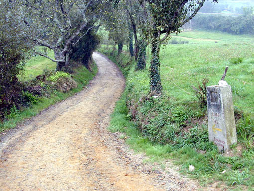 Der Weg verschwindet im Dunst, aber den Kilometerstein sieht der aufmerksame peregrino sofort.